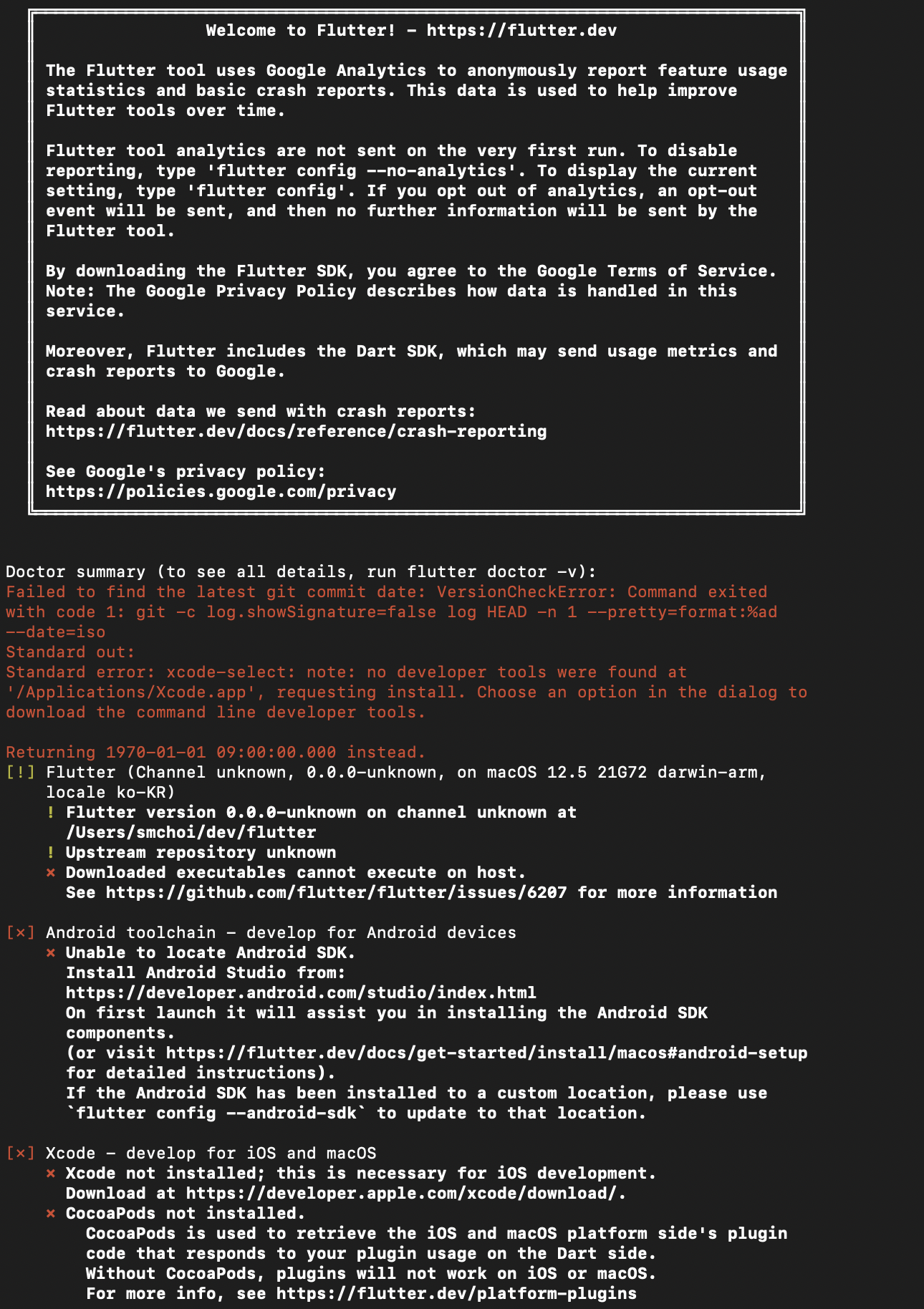 5. 설치가 되었는지 터미널에 "flutter doctor"를 입력