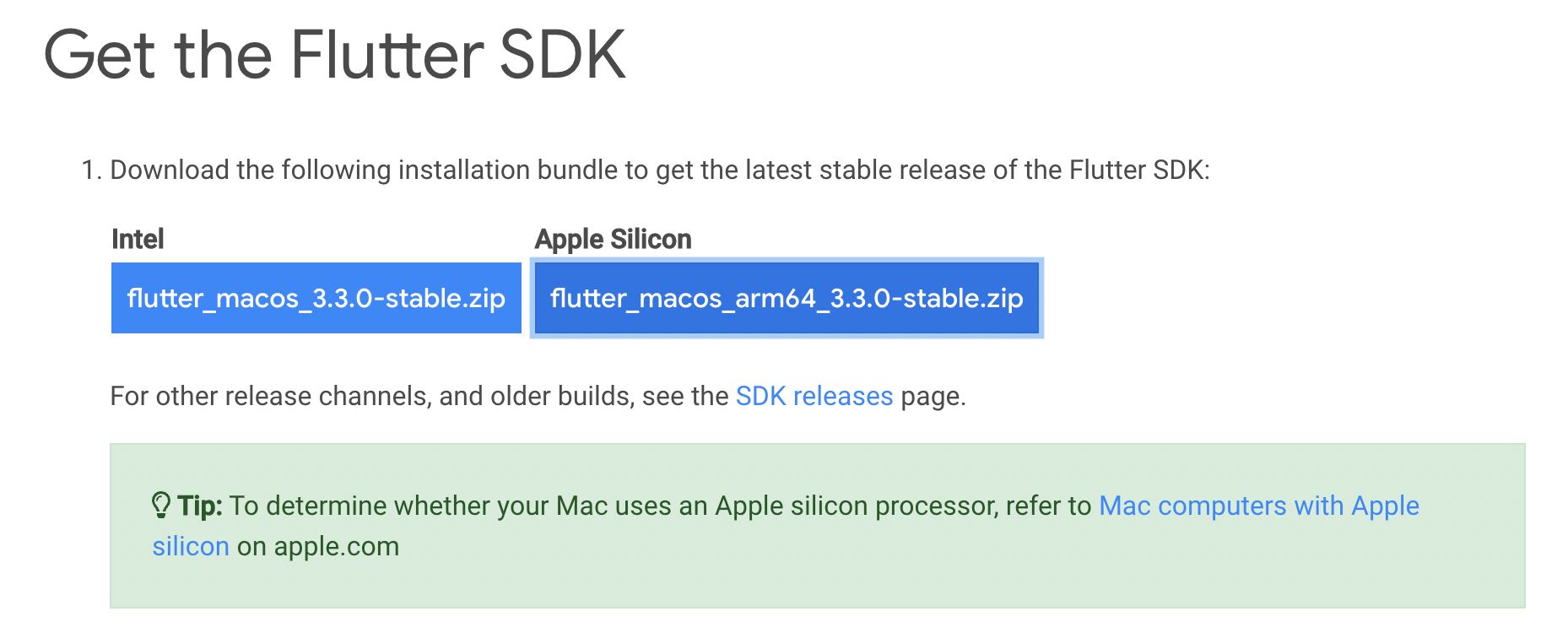 Flutter Document 사이트에 설치 가이드는 한국어로 되어 있으나, Mac OS는 한국 사이트는 설치파일에 오류가 있어서 영어 버전의 Document를 보는게 좋습니다.