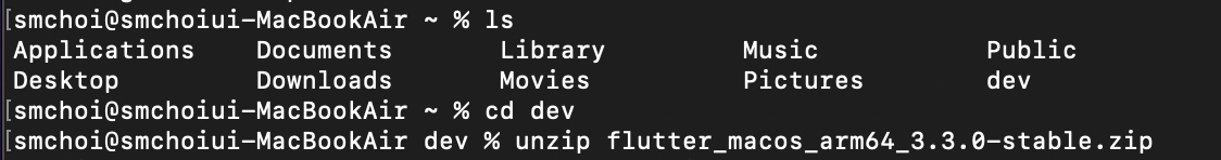 unzip ~/Downloads/flutter_macos_arm64_3.3.0-stable.zip